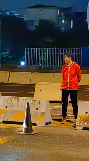 20点03分,在事故车辆后方100米左右的位置,记者看到一位身穿红色外套、黑色薄裤,年龄50岁许的阿姨。她将一个布满灰尘的警示锥放在右侧单车道与隔离带交接的白线上,站在警示锥后方提醒着后方来车注意事故情况,靠右行驶。