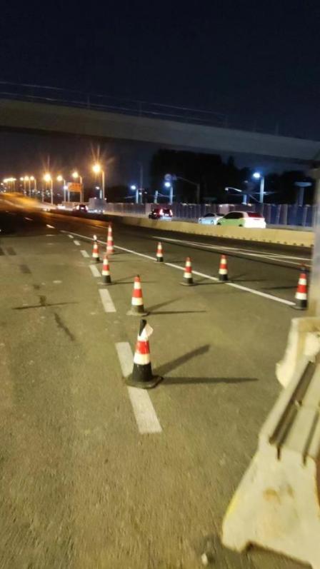 现场一位头戴卡其色鸭舌帽的大爷告诉记者,隔离带明显发生方向偏移,但缺失提醒方向变化的反光条。记者观察发现,隔离带上用油漆绘制了黄黑条纹线,但由于长期处于施工区域,油漆线上布满灰尘,颜色暗淡。在光照不充足的环境中,该条纹不明显,无法发挥警示作用,并且该手绘条纹也不属于《道路作业安全标志》中规定的标志与设施。