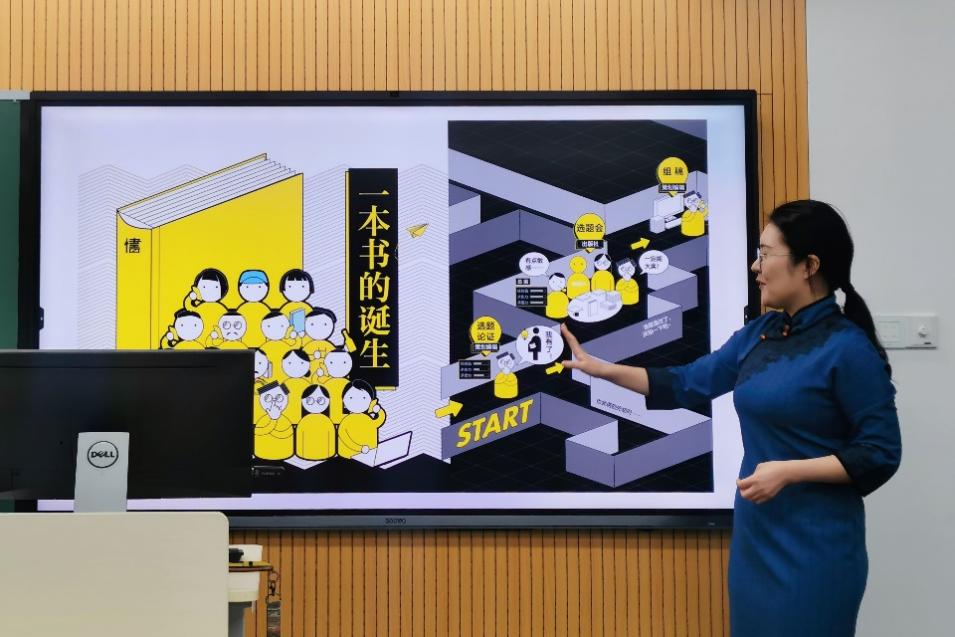 随后,朱静蔚以动漫图文的形式详细讲解了一本书的诞生过程,展现了书籍出版行业的基本流程,并从其中可以发挥创意的岗位之一“作者”视角为同学们带来进一步介绍。