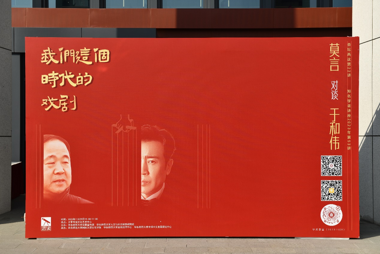 2023年11月20日下午15时,“我们这个时代的戏剧:莫言对谈于和伟”活动在华东师范大学闵行校区大零号湾文化艺术中心举行。在对谈中,莫言老师高调表白,“见了于和伟,此生不怕鬼”。诺贝尔文学奖得主与国家一级演员强强联手,活动一经公布,引起全校轰动。700张门票,一票难求,闲鱼上更是把价格炒到了五位数。