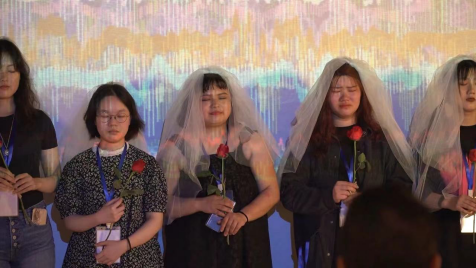 在ED Healer21年举办的「身材焦虑」主题展开幕式上有一个特别的环节:艺术疗愈“自婚仪式”。策展的女孩们被邀请上了台,主持人引导她们进入对婚礼场景的沉浸式想象。她们中的许多人在鹅黄色的灯光沐浴中哽咽落泪——或许她们想起曾经痛苦曲折的“淋雨”经历,又或许她们为如今能够给更多女孩“撑伞”而喜悦。