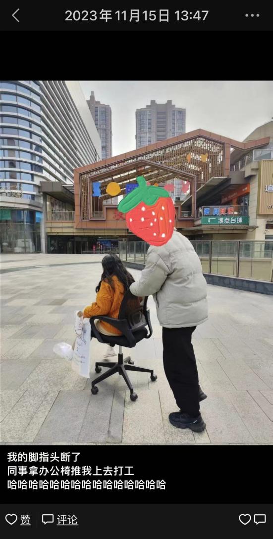 帕帕的固定休闲活动是“每周一山”。每周一爬山是因为帕帕难以排解的工作压力。“就想找个没人类的地方待着。”曾有一段处在离职边缘的低谷时期,帕帕常常半夜惊醒,为工作发愁。因为没时间“摸鱼”,帕帕一整天都不需要给手机充电。帕帕也害怕自己“死在工地”,辅酶Q便是帕帕用来防猝死的补剂,她选择的保健品也大多是主打护眼、护肝功效的“打工人刚需”。“还把保健品停掉吃了一阵子中药,但中药还没喝完,我的脚趾头就断了。”2023年11月,帕帕还是被同事用办公椅推着去上班的“打工瘸子”。