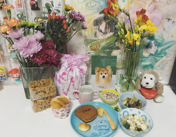 陈敏选择的善终项目包含了陪同火化,她用明黄色的小毯子包住拉拉,像抱婴儿一样横抱着它坐在汽车后座。陈敏记得那天天气很好,她用毯子盖住拉拉防止被阳光照射。从徐汇到青浦的车程要1个多小时,到火化场时已经是中午,她记得当时要火化的宠物有两三只。陈敏把拉拉放在小床上,由宠物善终师进行仪容整理。善终师用小剪刀修剪拉拉的毛发,印下了它的脚印,并剪下它的指甲交给陈敏。十多分钟后,陈敏抱着拉拉到旁边的小沙发上,进行最后的告别仪式。“再见了,我的天使。”在善终师的祷告声,陈敏把一束粉色的康乃馨放在拉拉的身边,它的身边是鲜花、蜡烛和祝福。