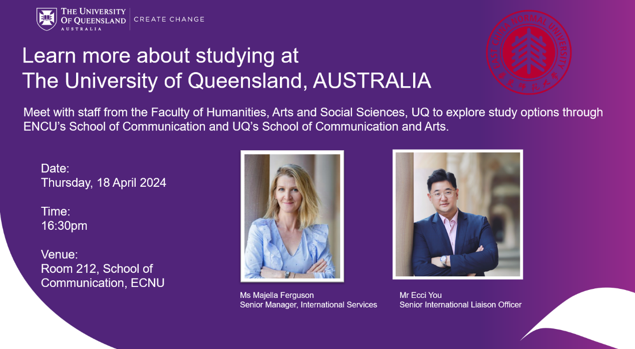 项目采取“2+2”的形式,ag亚游-真人ag-亚游平台 本科学生可于大二期间申请,成功录取后于大三大四学年赴昆士兰大学学习,在达到双方的毕业要求之后可以分别拿到两校的学士学位。