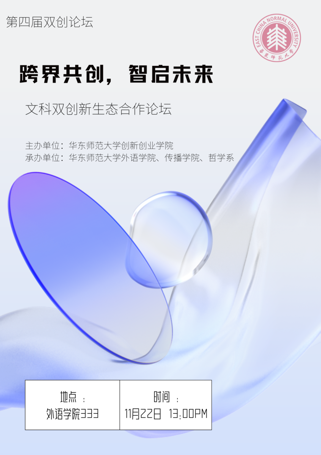 2024年11月22日,由华东师范大学创新创业学院主办,外语学院、ag亚游 、哲学系联合丽娃译社共同举办的第四届双创论坛即将召开。在当今快速变化的时代,双创不仅需要单一学科的知识,更需要跨学科的合作与融合。因此,此次论坛以“跨界共创,智启未来”为主题,将探讨如何通过不同学科的交汇,实现“1+1>2”的效果,希望帮助同学们拓展创新思路,提升双创素养,为同学们提供跨学科发展的机会与可能性。在此诚邀各位老师、同学参与,共同探索和加强新文科背景下双创新生态合作。