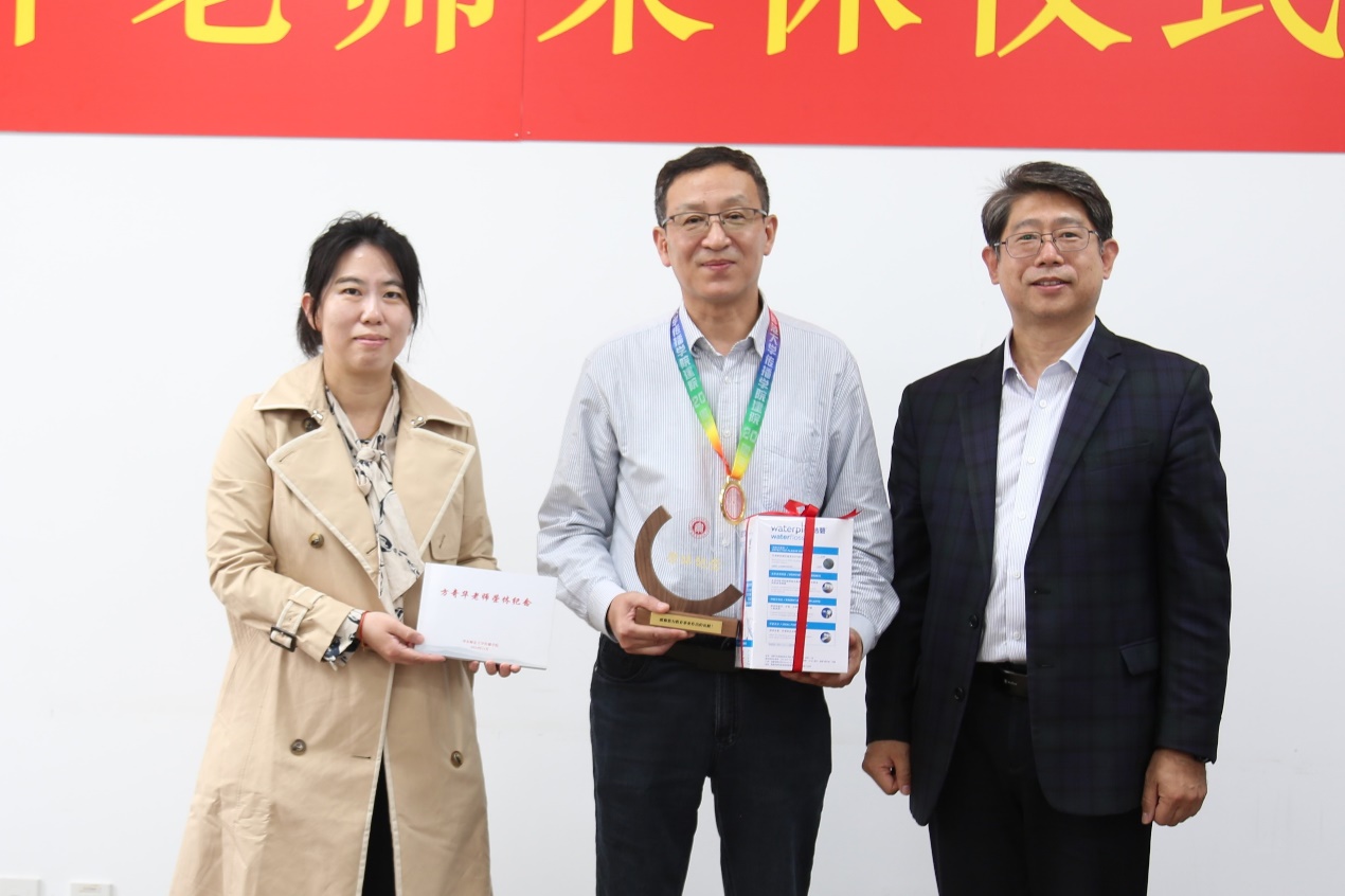 王峰院长代表全院向方奇华老师颁发“传薪”奖章及荣休纪念品,感谢方老师多年来对学院发展的无私奉献;朱文佳书记送上凝聚学院全体教职工祝福的荣休纪念册,一张张照片定格方奇华老师与学院师生并肩奋斗、攻坚克难的往昔足迹,传递美好祝愿。