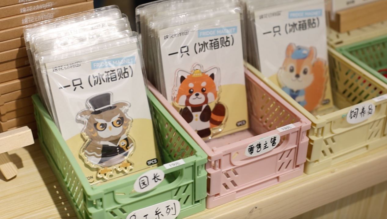 我们第一次来到故事商店的那天,恰好也是主题“棉花动物园”下线前的最后一天。店里面积不大,甚至可以说是有点袖珍。为了充分利用仅有的空间,店内的桌子上、橱柜上、墙上都放满了商品。据店主介绍,他们是长宁区的本土文创品牌,正在将动物IP与职场生活相结合,打造出更受年轻人青睐的文创产品,同时贯彻保护野生动物的理念,呼吁更多人关注生态环境。