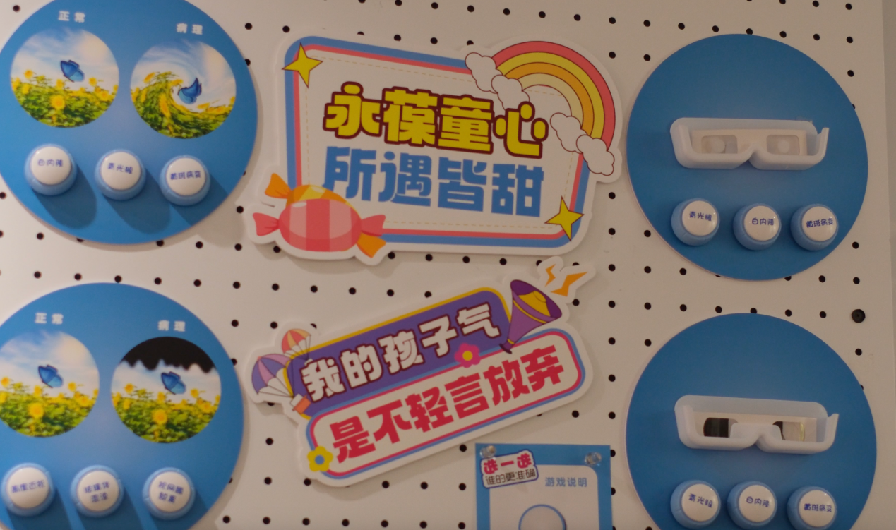 这次的店面经过了简单的翻修焕然一新,墙上挂的不再是商品,而是眼科科普道具。这次的店主是一名眼科大夫,在她的介绍之下,我们饶有兴致地玩起了科普游戏,也学到了不少眼科知识。